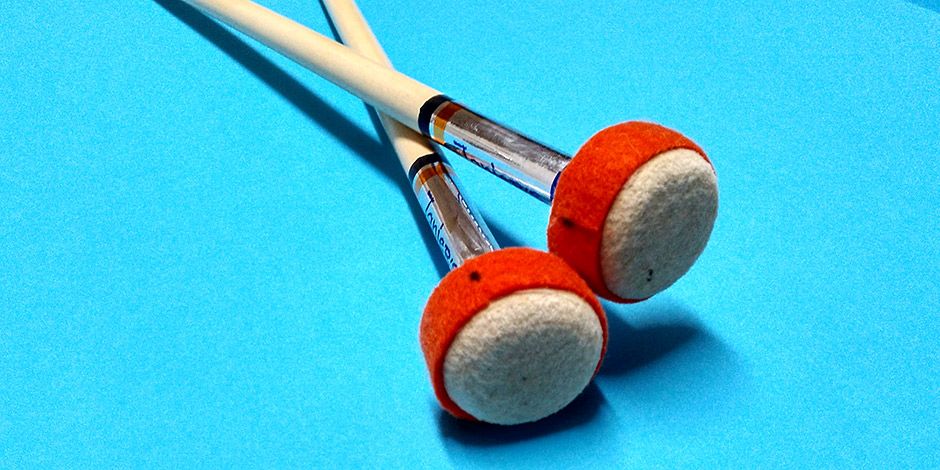 Baqueta para Tímpanos, cabo de madeira e feltro duro branco, revestido com uma tira fina de feltro na cor laranja.